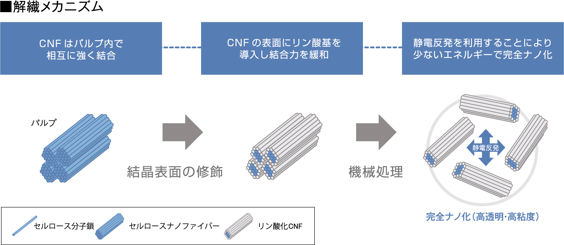 王子グループでは、製造時の微細化エネルギーを低減する有効な手法として「リン酸エステル化法」を採用しています。