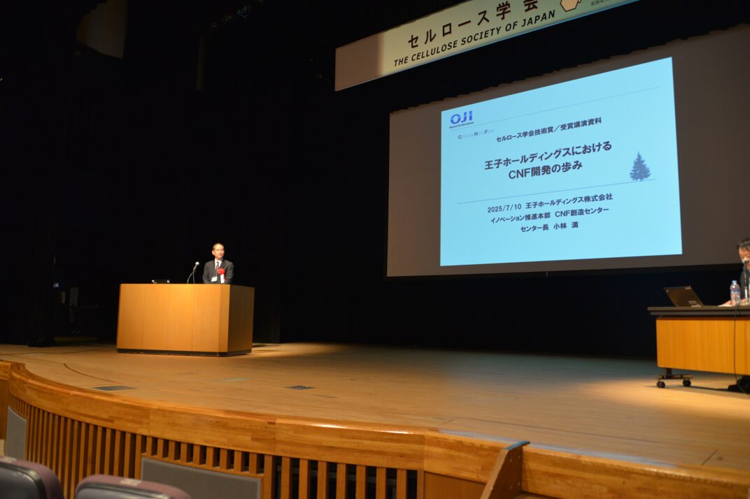 表彰式では、王子HDの代表者であるCNF創造センターの小林センター長が登壇し、受賞技術の概要と今後の展望について講演を行いました。